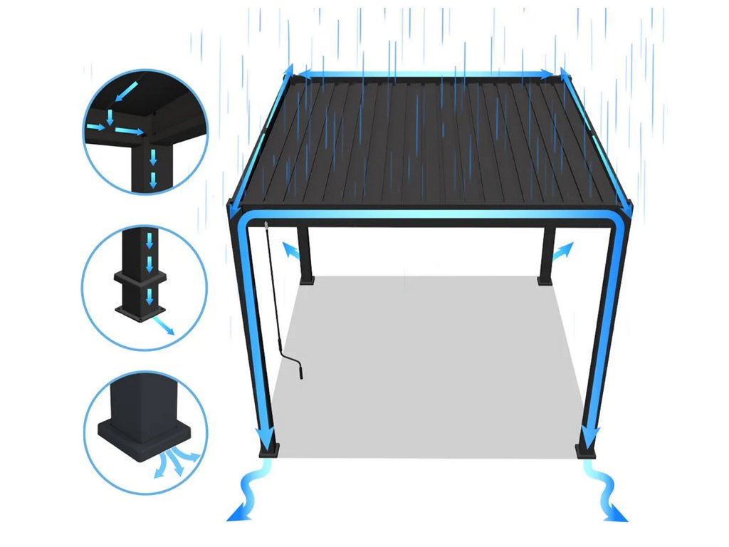 Pergola je vybavena moderním integrovaným okapovým systémem pro odvod vody, který účinně odvádí déšť mimo obrys konstrukce. To zajišťuje kontrolu nad odtokem a dodatečnou ochranu terasy a jejího vybavení před vnějšími vlivy.