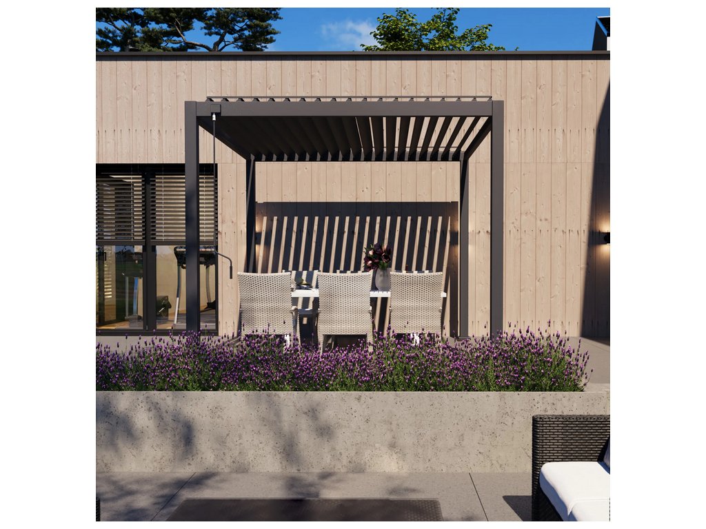 Terasová pergola Classic 3x3 Anthracite je stylové a funkční řešení, které obohatí každý venkovní prostor. Díky pohyblivým ocelovým lamelám lze volně regulovat množství světla, což zajišťuje stín v horkých dnech a větrání v teplejších večerech. Integrovaný okapový systém účinně odvádí vodu, čímž chrání povrch pod pergolou před zaplavením. Stabilní, práškově lakovaná hliníková konstrukce zajišťuje odolnost proti korozi a dlouhou životnost. Je to ideální řešení pro ty, kteří ocení funkčnost, estetiku a trvanlivost.