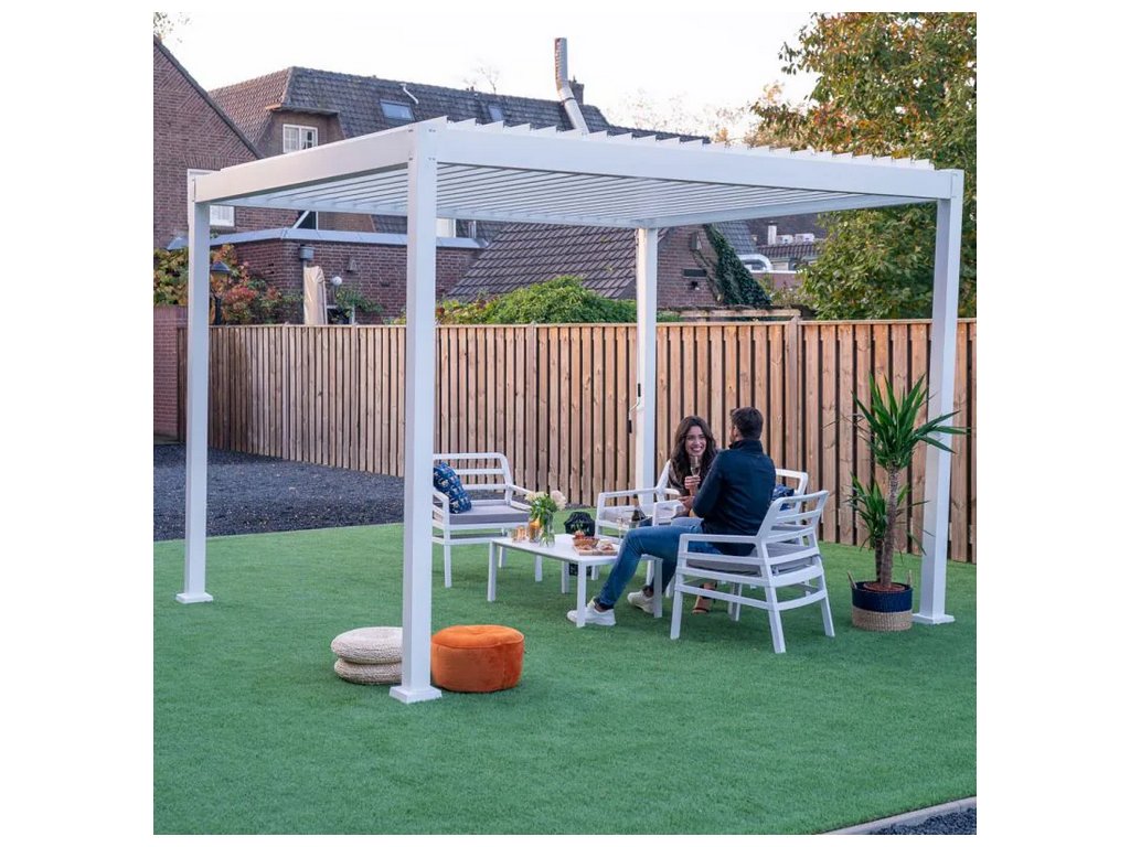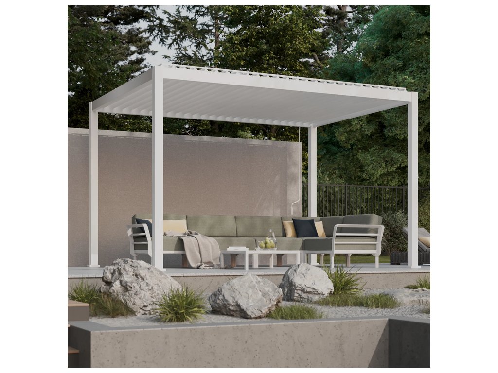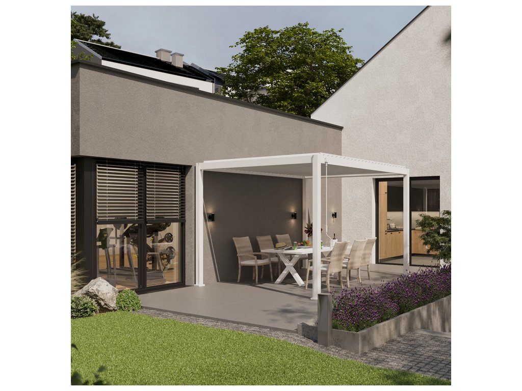 Zahradní pergola na terasu Premium 3x4 white je elegantní a funkční zastřešení, ideální pro vytvoření útulného prostoru pod širým nebem. Je vyrobena z vysoce kvalitního hliníku, který zajišťuje trvanlivost a odolnost proti povětrnostním vlivům. Pohyblivé ocelové lamely umožňují regulovat sluneční záření a přizpůsobit úroveň stínu individuálním potřebám. Na rozdíl od modelu Classic nabízí pergola Premium možnost výběru doplňkových příslušenství, jako jsou posuvné dveře, rolety a žaluzie, což umožňuje plně přizpůsobit prostor vlastním preferencím.