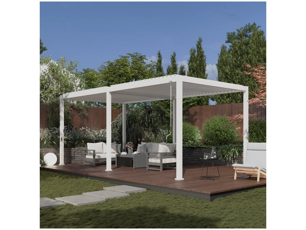 Zahradní pergola na terasu Premium 3x6 white značky Gutroof je elegantní a funkční zastřešení, ideální pro vytvoření útulného prostoru pod širým nebem. Je vyrobena z vysoce kvalitního hliníku, který zajišťuje trvanlivost a odolnost proti povětrnostním vlivům. Pohyblivé ocelové lamely umožňují regulovat sluneční záření a přizpůsobit úroveň stínu individuálním potřebám. Na rozdíl od modelu Classic nabízí pergola Premium možnost výběru doplňkových příslušenství, jako jsou posuvné dveře, rolety a žaluzie, což umožňuje plně přizpůsobit prostor vlastním preferencím.