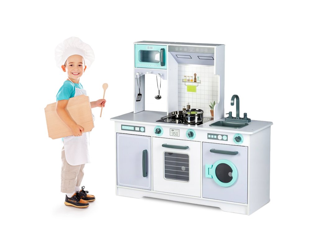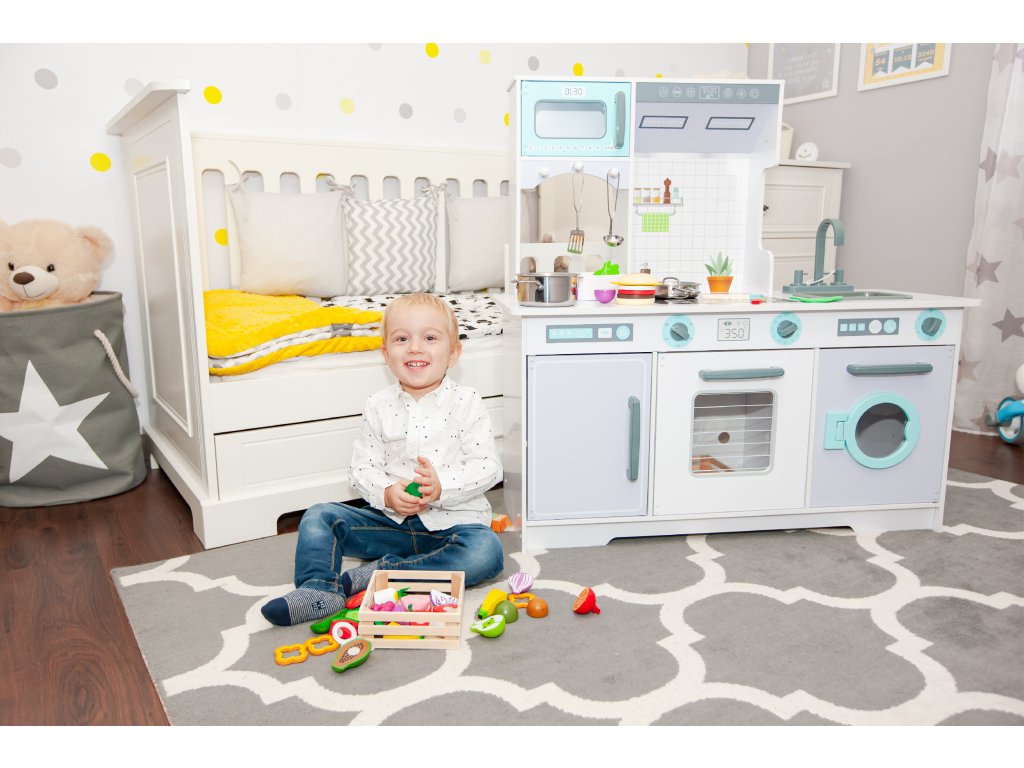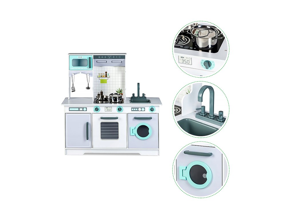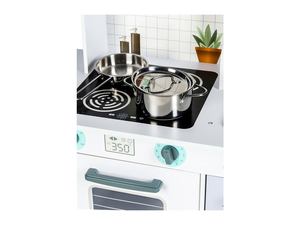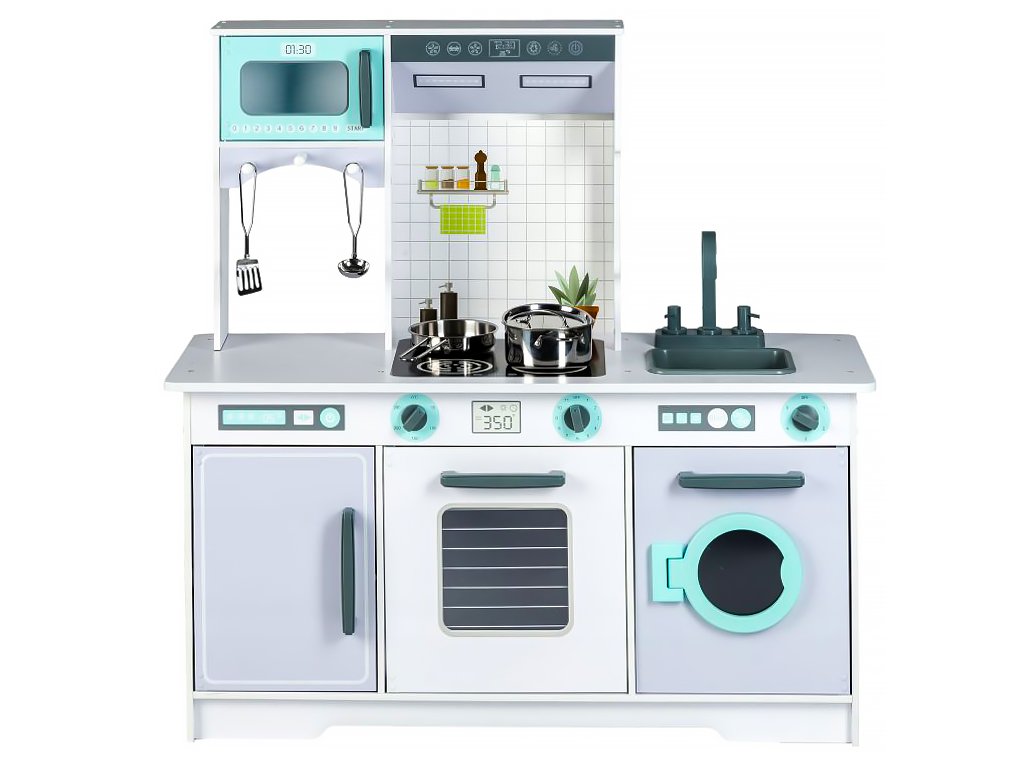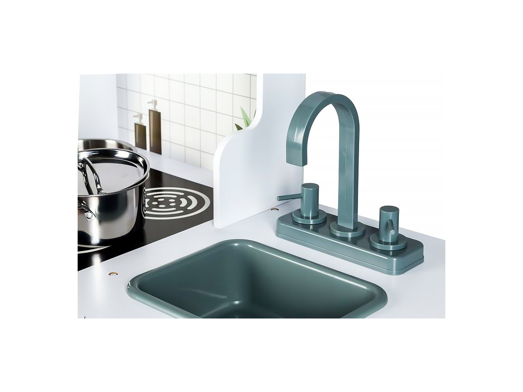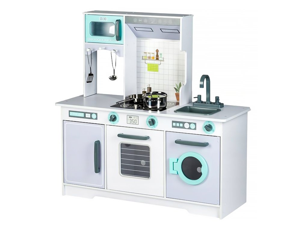 Použití nejlepších materiálů při výrobě kuchyně zaručuje, že vydrží mnoho let. Kuchyně je vyrobena z dřeva a MDF desek. Kuchyňská linka je vybavena vším potřebným, mimo jiné: pohyblivým kohoutkem, dřezem, otevíratelnou troubou, skříňkou, klikacími knoflíky, hodinami, mikrovlnnou troubou a pračkou s otevíratelnými dvířky. Sada navíc obsahuje 5 kuchyňských doplňků (hrnec s poklicí, pánev, lopatka, naběračka), které zpestří hraní. Všechny dřevěné prvky jsou zbaveny nebezpečných hran.