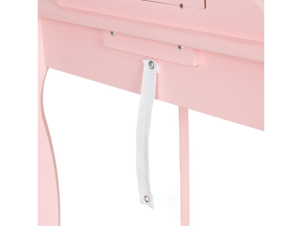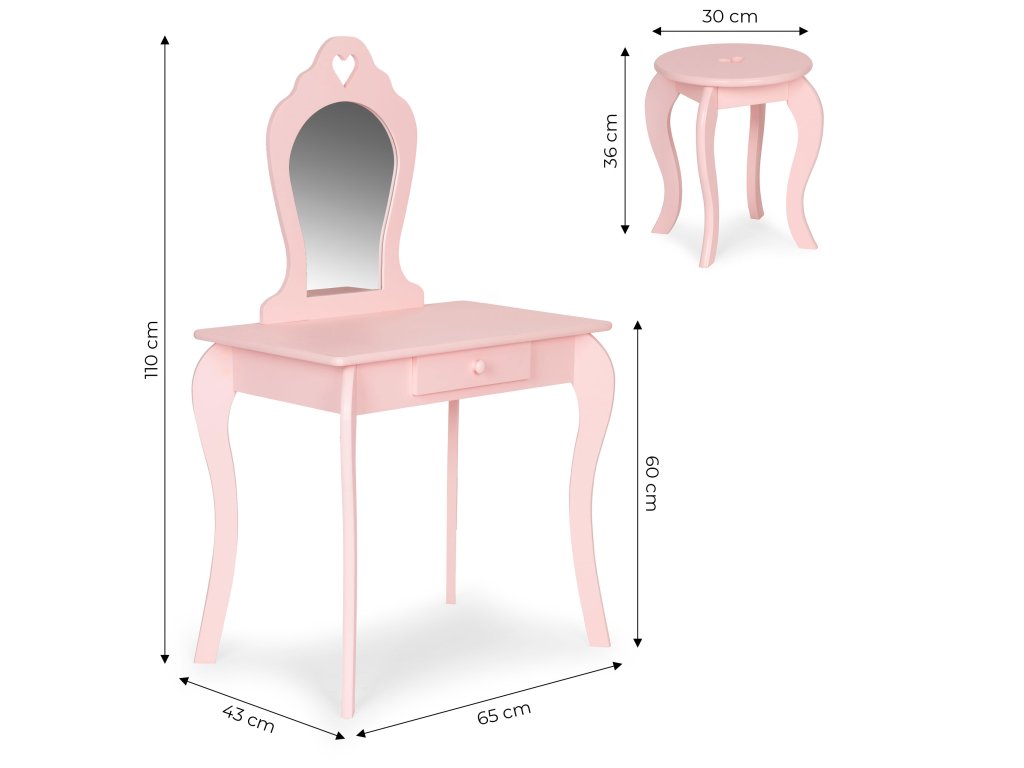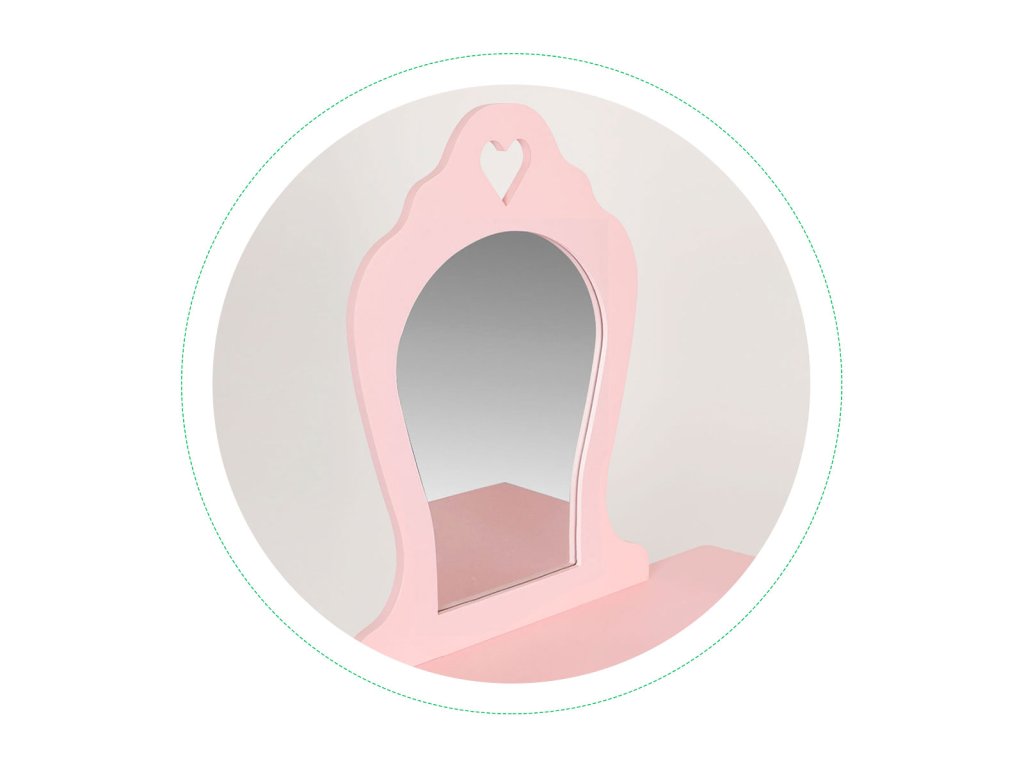 Hlavním rysem tohoto toaletního stolku je velké dekorativní zrcadlo, které dodává šarm a umožňuje malým holčičkám prohlížet si své oblečení a užívat si hraní. Zrcadlo má krásný tvar, který podtrhuje eleganci toaletního stolku a zároveň zachovává dívčí atmosféru.