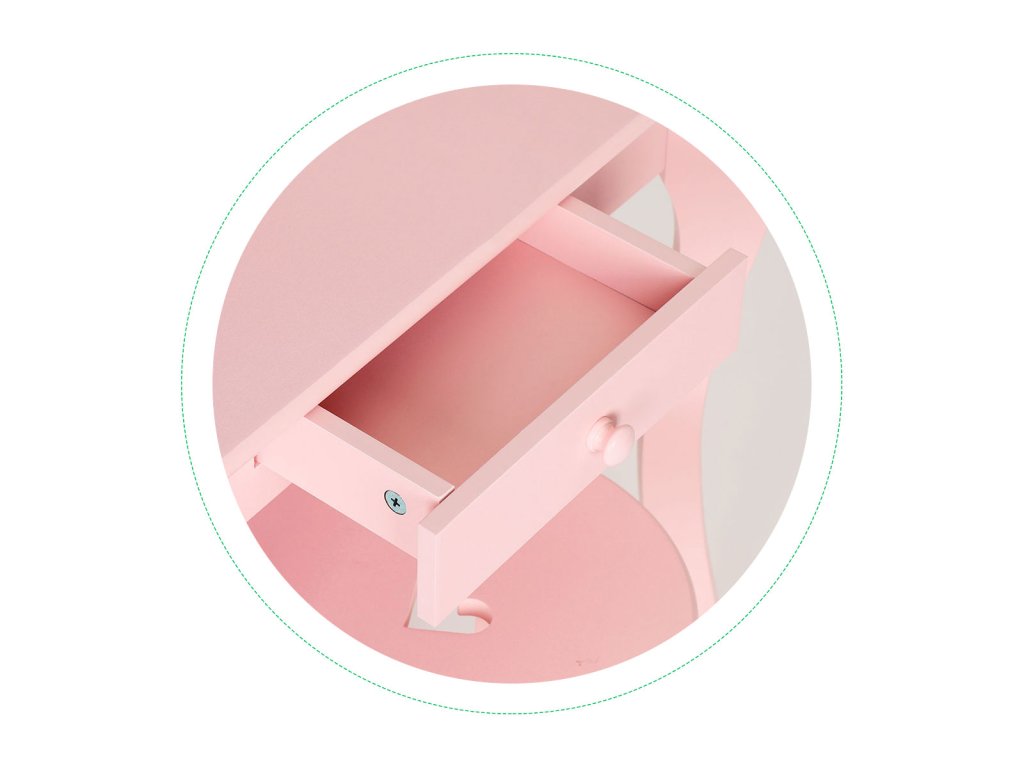 Toaletní stolek obsahuje praktickou zásuvku, do které si děti mohou uložit své poklady, šperky nebo hračky. Zásuvka je navržena tak, aby se snadno otevírala a zavírala, což dětem umožňuje samostatně organizovat svůj malý svět.