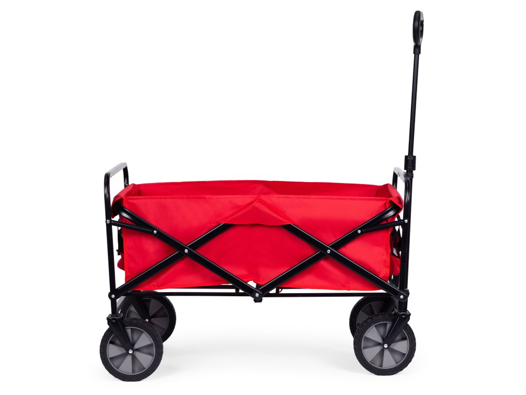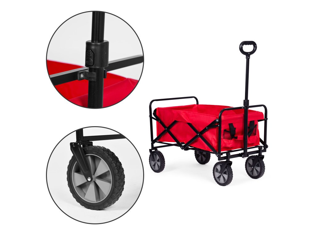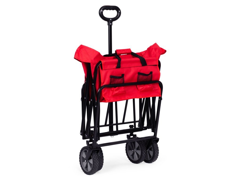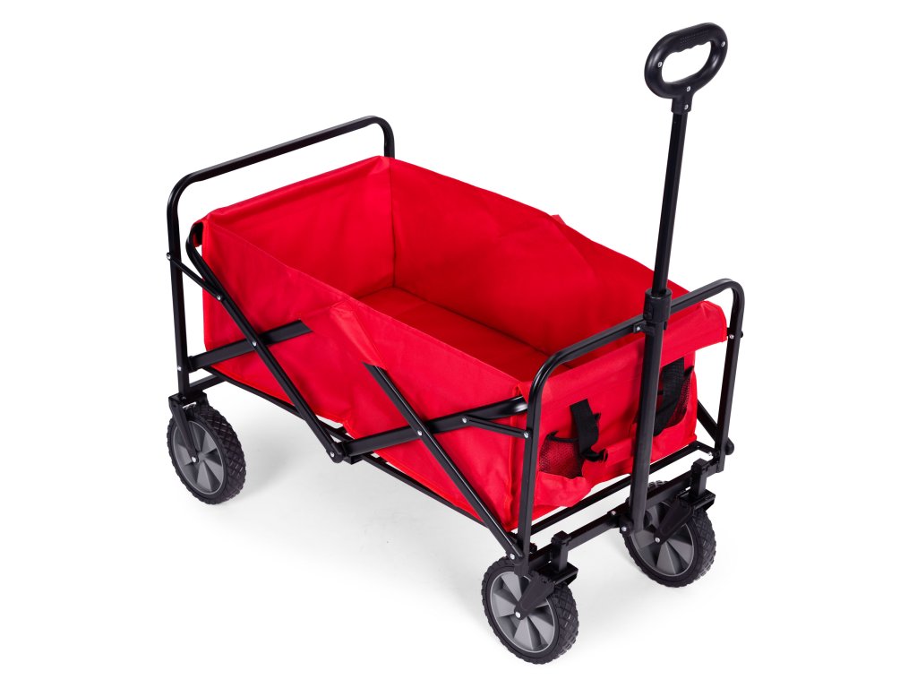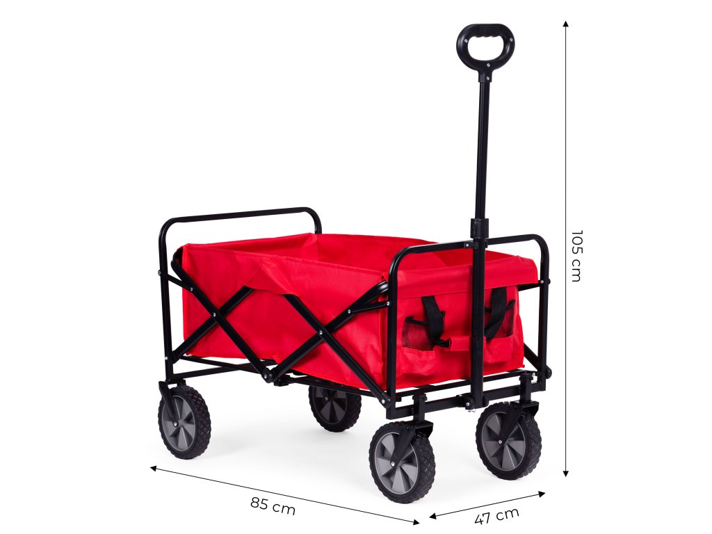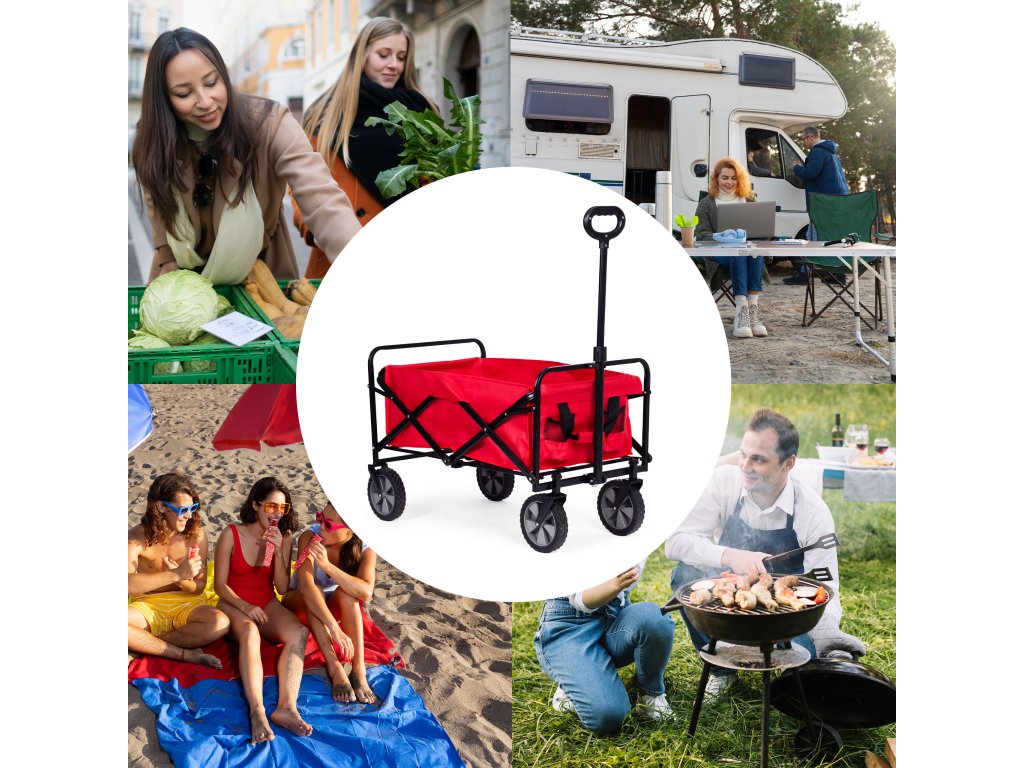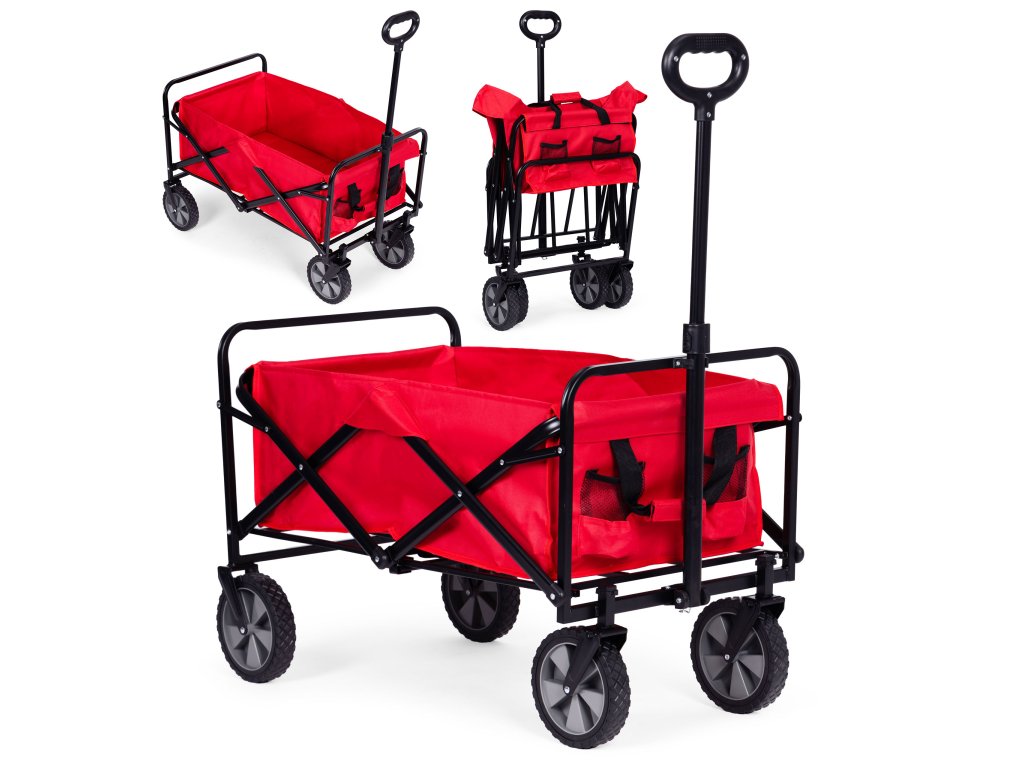 Skládací přepravní vozík v červené barvě je ideální na zahradu, na pozemek, na pláž i na dovolenou. Má robustní kovový rám, voděodolný materiál a velká gumová kola, což zajišťuje odolnost a snadné používání. Vozík je vybaven širokou, pohodlnou rukojetí na tahání, čtyřmi, praktickými kapsami na nápoje a rukojetí na přenášení, což usnadňuje přepravu nákupů, nářadí, zavazadel a plážového vybavení. Maximální nosnost vozíku je 100 kg.