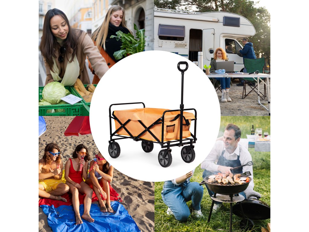 Skládací přepravní vozík v červené barvě je ideální na zahradu, na pozemek, na pláž i na dovolenou. Má robustní kovový rám, voděodolný materiál a velká gumová kola, což zajišťuje odolnost a snadné používání. Vozík je vybaven širokou, pohodlnou rukojetí na tahání, čtyřmi, praktickými kapsami na nápoje a rukojetí na přenášení, což usnadňuje přepravu nákupů, nářadí, zavazadel a plážového vybavení. Maximální nosnost vozíku je 100 kg.