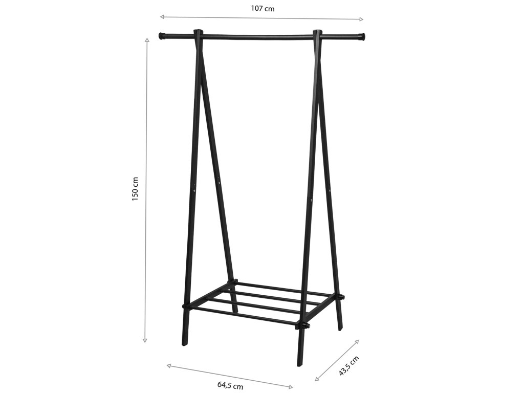 Stojan na oblečení značky ModernHome je vyroben z odolné práškově lakované oceli a nabízí stabilní a estetickou konstrukci odolnou proti každodennímu používání. Hlavní tyč umožňuje pohodlné zavěšení oblečení, zatímco spodní police o rozměrech 62 x 41 cm je ideální pro uložení obuvi nebo doplňků.