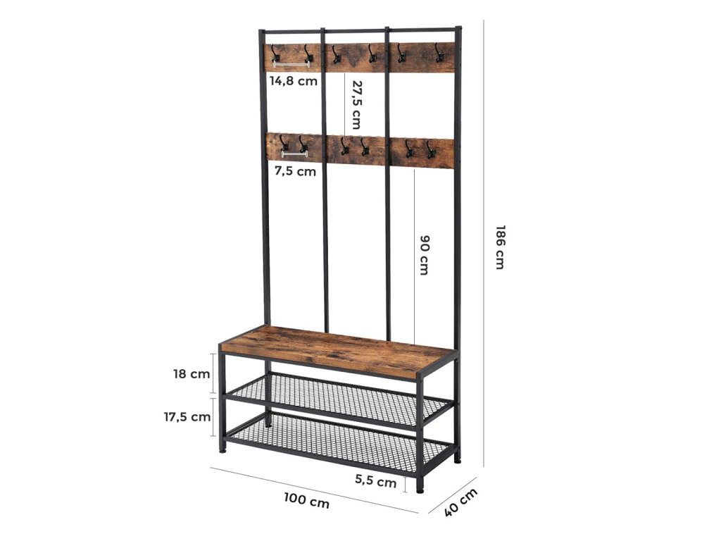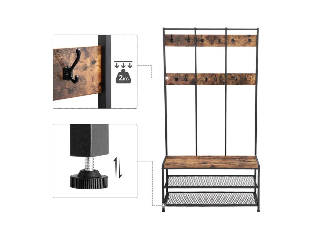 Stojan na věšáky je praktický kus nábytku, který pomáhá udržovat pořádek v předsíni nebo chodbě. Kovová konstrukce zajišťuje stabilitu, díky čemuž se věšák hodí jak do domácnosti, tak do kanceláře. Maximální nosnost háčku je 2 kg, sedáku 90 kg a polic na boty 10 kg. Rustikální provedení háčků a sedáku dodává věšáku na šarmu a nastavitelné nožičky umožňují jeho vyrovnání na nerovné podlaze.
