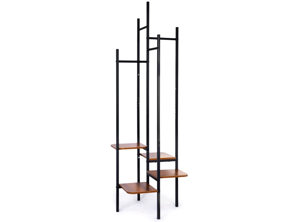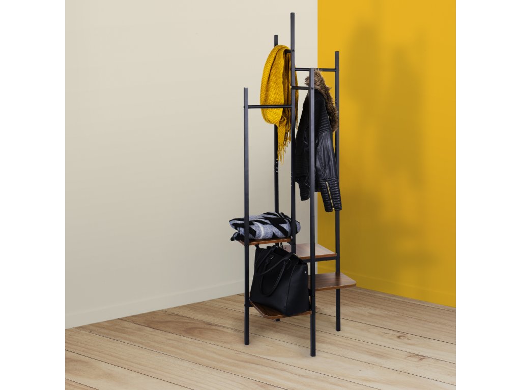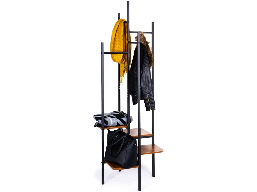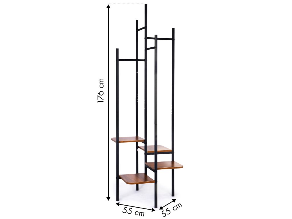 Věšák je vyroben z práškově lakované oceli a dřeva. Celková výška věšáku je 176 cm a rozteč nohou je 55 cm. Věšák má 4 kovové tyče, na které lze zavěsit ramínka na oblečení. Čtyři spodní police vyrobené z MDF jsou uspořádány v různých výškách a lze je použít k odkládání bot, kabelek nebo i dekorativních květin. Každá police má rozměry 28x24 cm. Nohy jsou zakončeny plastovými krytkami, které chrání povrch před poškrábáním.