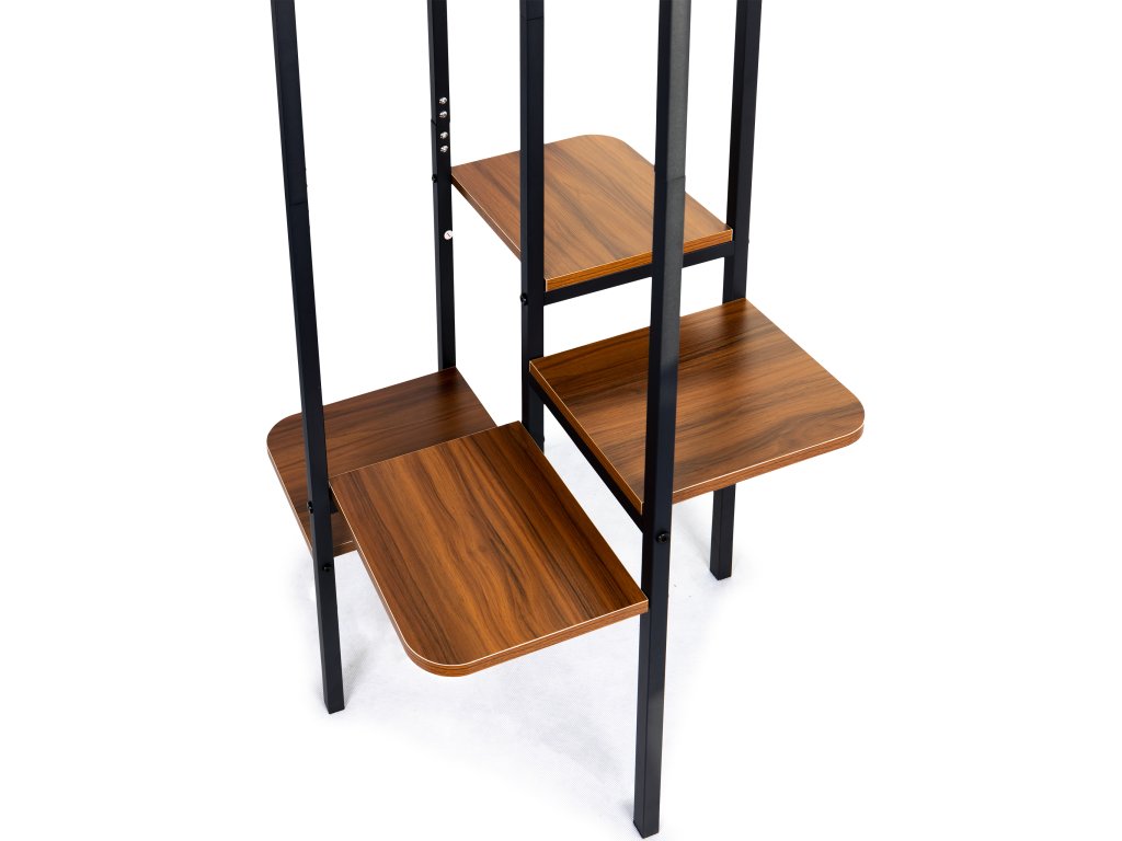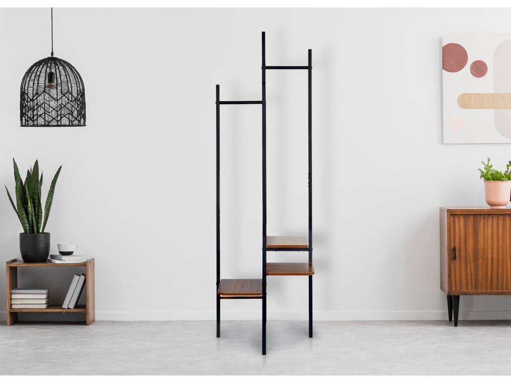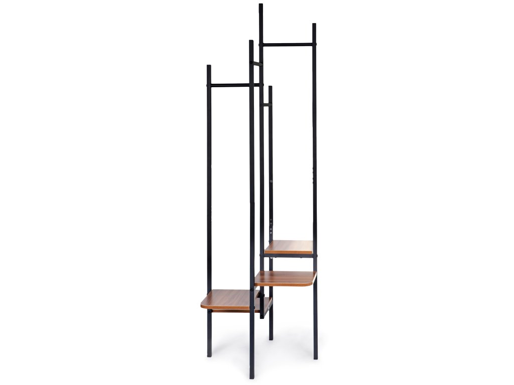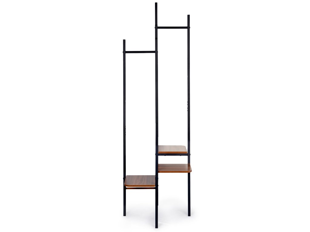 Věšák je vyroben z práškově lakované oceli a dřeva. Celková výška věšáku je 176 cm a rozteč nohou je 55 cm. Věšák má 4 kovové tyče, na které lze zavěsit ramínka na oblečení. Čtyři spodní police vyrobené z MDF jsou uspořádány v různých výškách a lze je použít k odkládání bot, kabelek nebo i dekorativních květin. Každá police má rozměry 28x24 cm. Nohy jsou zakončeny plastovými krytkami, které chrání povrch před poškrábáním.