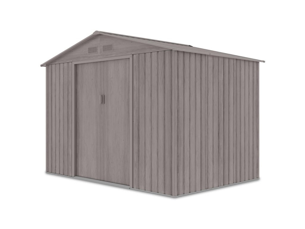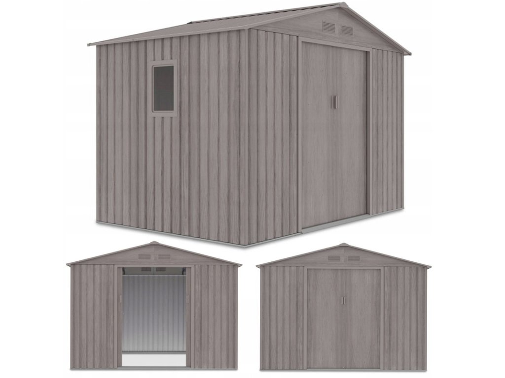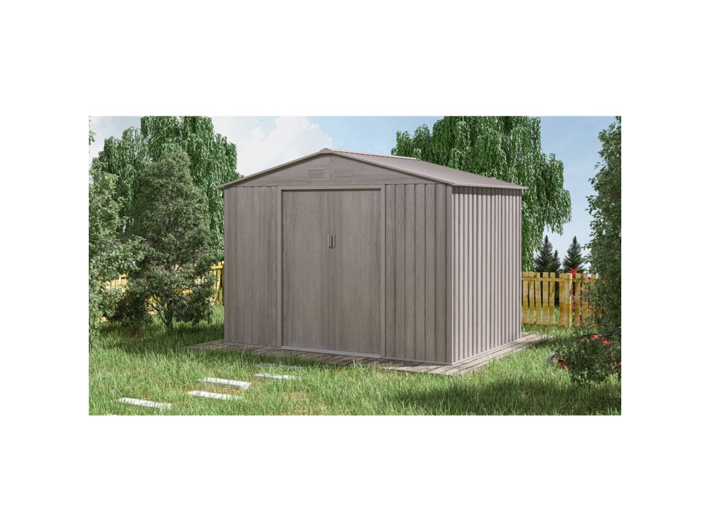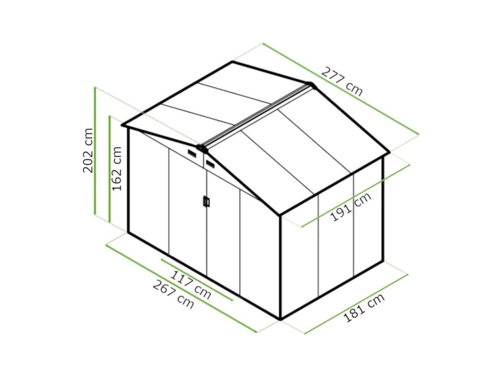 Zahradní domek HUDSON o rozměrech 277x191 cm nabízí 4,83 m² užitného prostoru, který je ideální pro skladování zahradního nářadí a nářadí. Konstrukce z pozinkované oceli se vyznačuje mimořádnou odolností a odolností proti korozi, což zaručuje dlouhou životnost. Dvojité posuvné dveře umožňují snadný přístup a jejich zajištění visacím zámkem zvyšuje ochranu obsahu. Větrací otvory účinně omezují problém vlhkosti a chrání uložené nářadí před rzí a plísní.