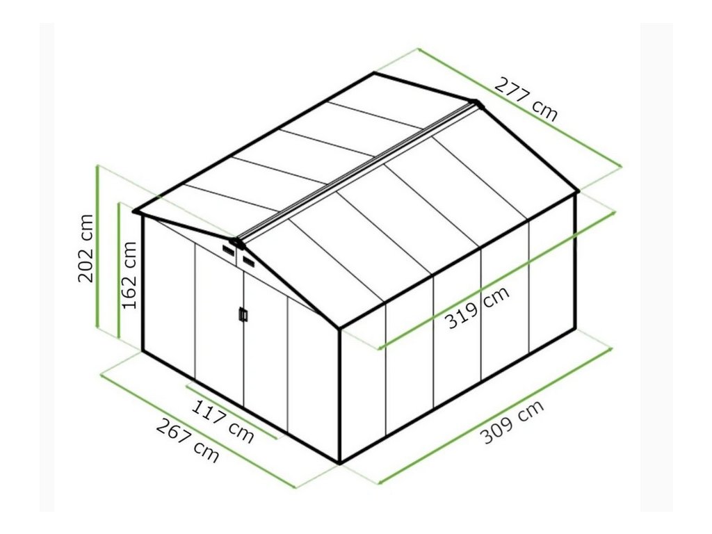 Zahradní domek HUDSON 277x319 cm je prostorná kutilská bouda, která nabízí až 8,25 m² užitné plochy pro nářadí a zahradní vybavení. Konstrukce z pozinkované oceli se vyznačuje vynikající odolností proti korozi a dlouhou životností, díky čemuž bouda vydrží sloužit mnoho let. Praktické posuvné dveře umožňují snadný přístup do vnitřního prostoru a možnost uzamčení na visací zámek zajišťuje dodatečnou bezpečnost. Domek je vybaven ventilačními otvory, které účinně zabraňují hromadění vlhkosti a chrání obsah před plísní a korozí.