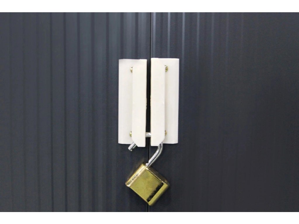 Dveře domku HUDSON jsou vybaveny úchytem, který umožňuje připevnění visacího zámku nebo zámku, což zajišťuje dodatečnou ochranu obsahu. Visací zámek není součástí dodávky, takže si uživatel může vybrat nejvhodnější zabezpečení podle svých potřeb.
