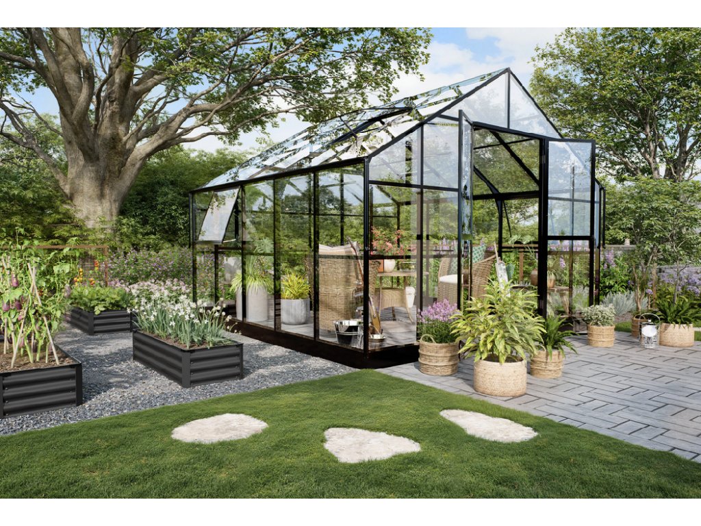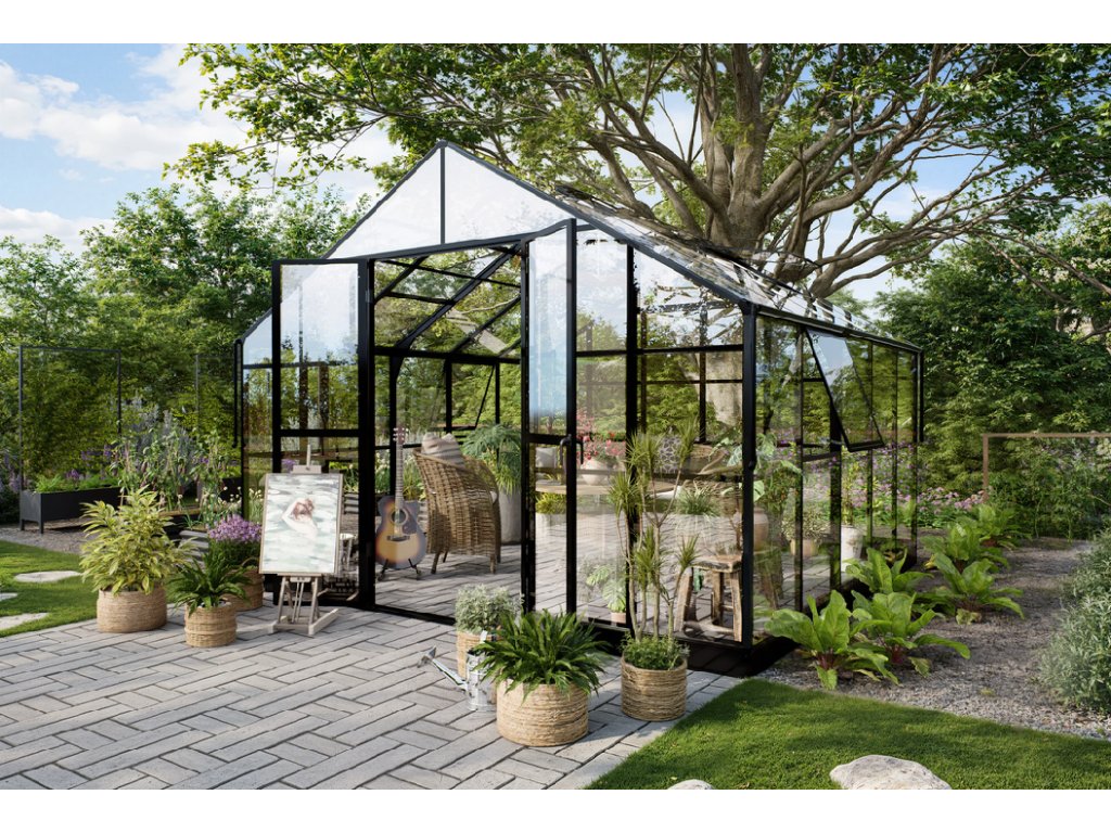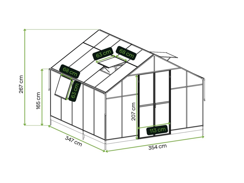 Dveře jsou vybaveny zámkem pro větší bezpečnost a funkcí větrání. Díky integrovanému okapovému systému se čtyřmi hliníkovými svodovými trubkami skleník účinně odvádí dešťovou vodu. Vybavení robustní 12centimetrovou základnou z pozinkované oceli zajišťuje stabilitu konstrukce i za nepříznivých povětrnostních podmínek.