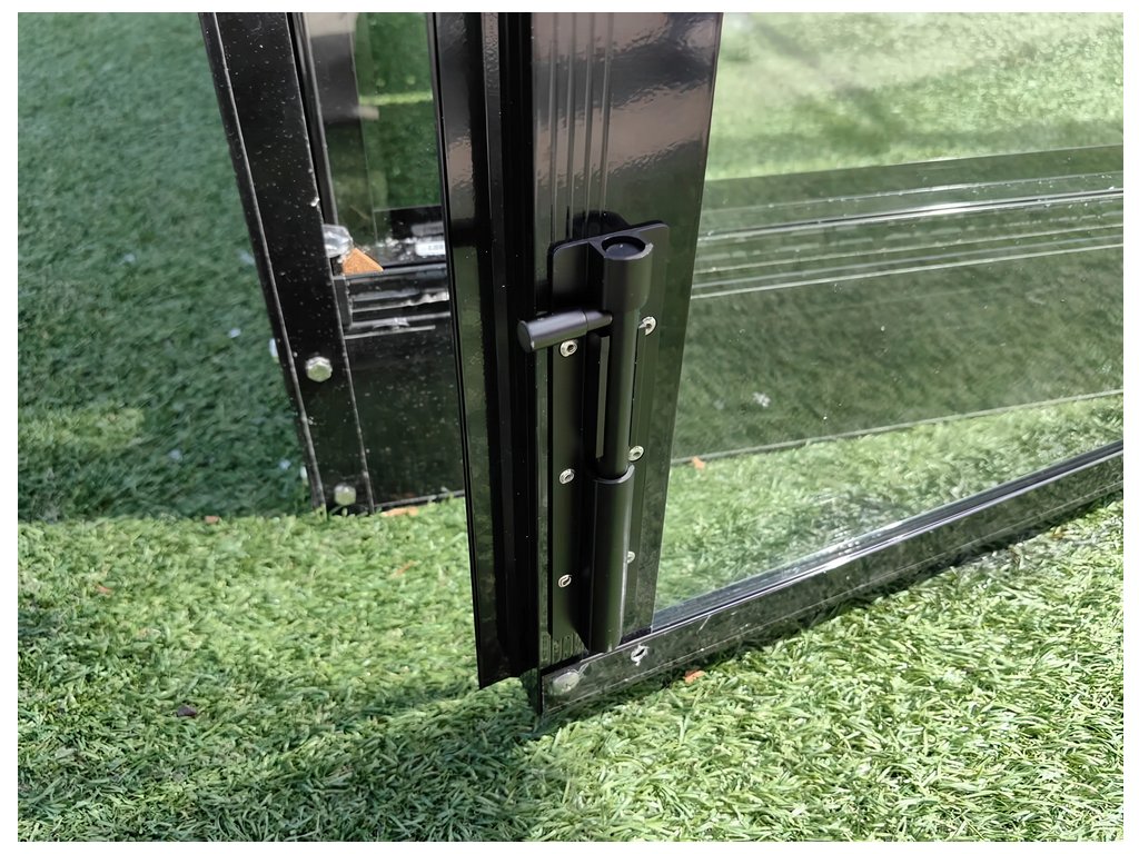 Skleník SOLID PC je vybaven inovativním systémem rychlého spojování, který eliminuje potřebu použití posuvných šroubů. Předem nainstalované matice ve spojích umožňují rychlé a přesné sestavení konstrukce. Toto řešení šetří čas a zabraňuje problémům při montáži. Skleník zajišťuje pohodlný přístup díky nízkému prahu dveří o rozměrech: 113 cm na šířku a 207 cm na výšku. Díky tomu lze snadno vnášet a vynášet větší předměty, jako např. kolečko.