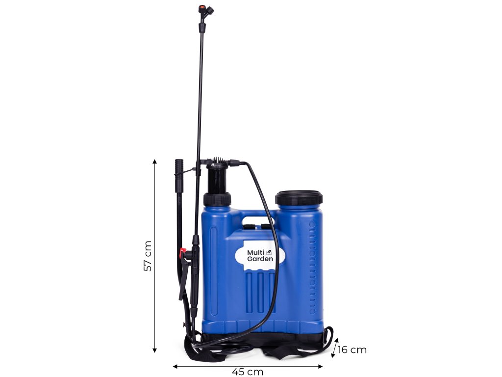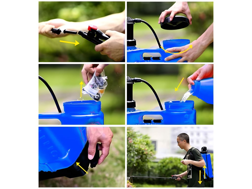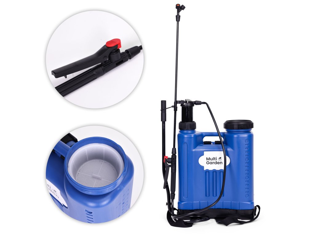 Postřikovač je vybaven nastavitelnými ramenními popruhy, které umožňují pohodlné nošení ve stylu batohu během používání. Tím je zajištěno rovnoměrné rozložení hmotnosti, což výrazně snižuje únavu a umožňuje delší a pohodlnější práci na zahradě. Odolné, měkké popruhy zajišťují stabilitu, a jejich nastavitelná délka umožňuje přizpůsobení individuálním potřebám.