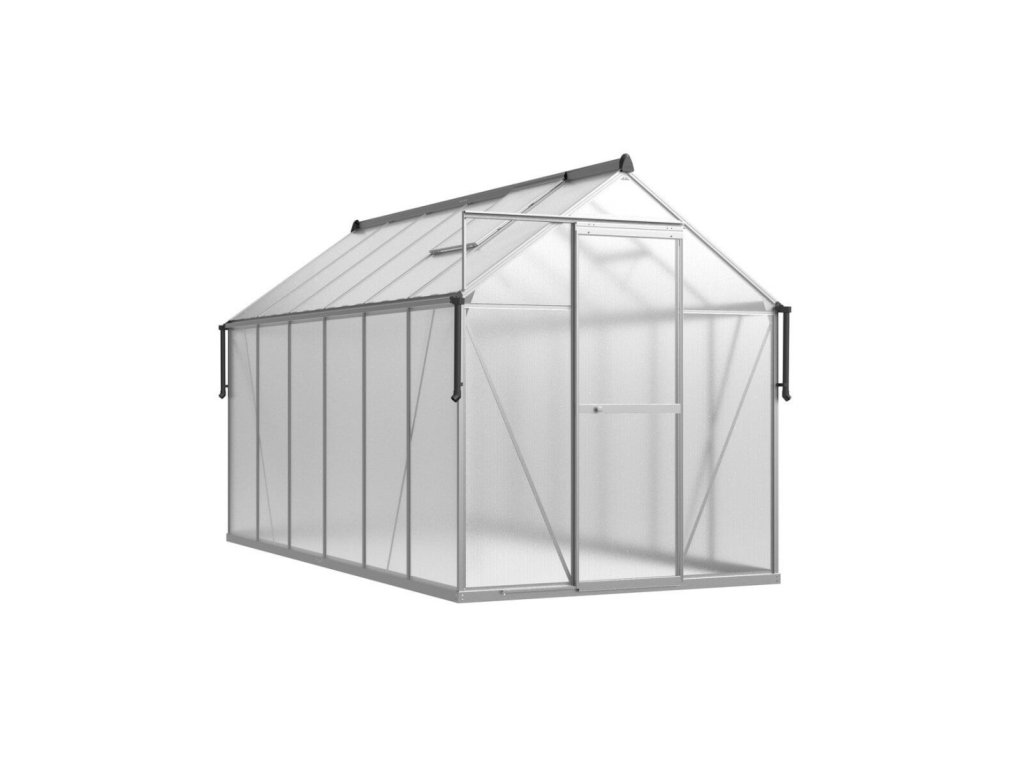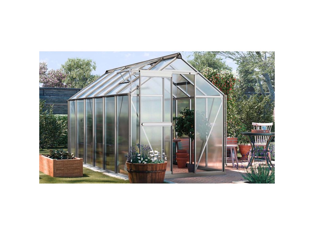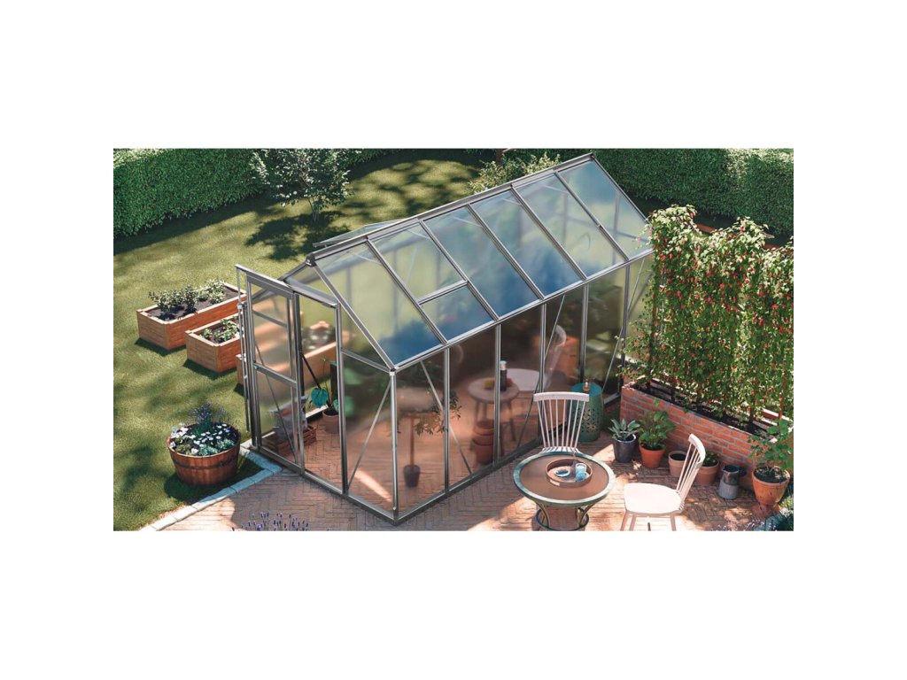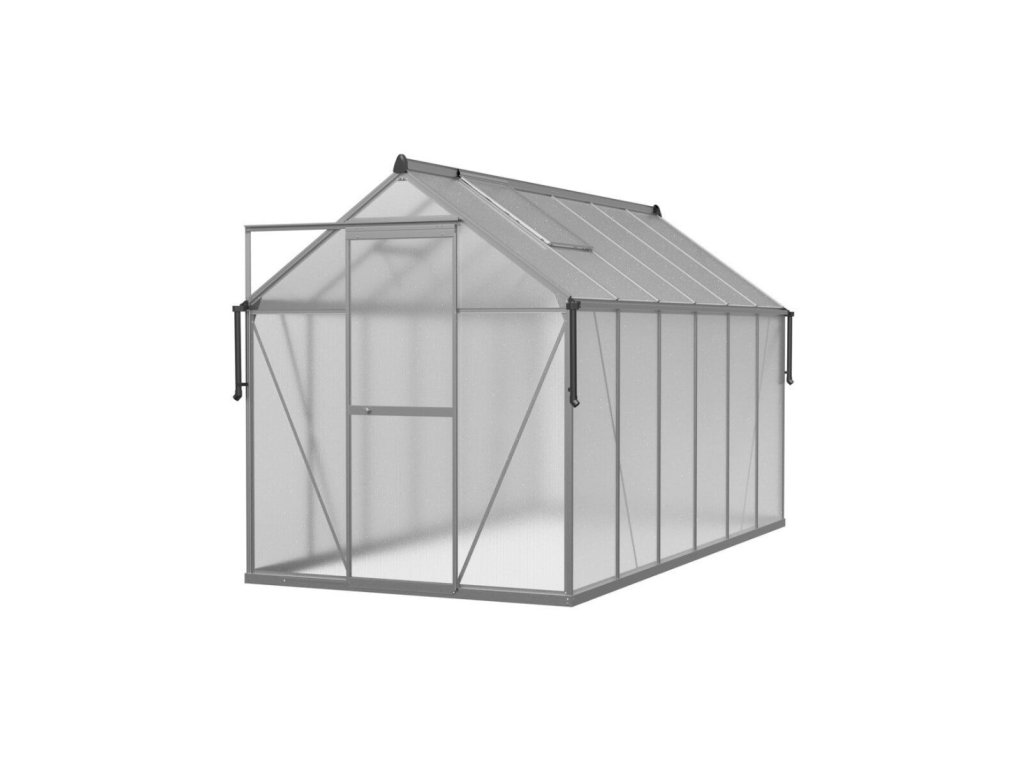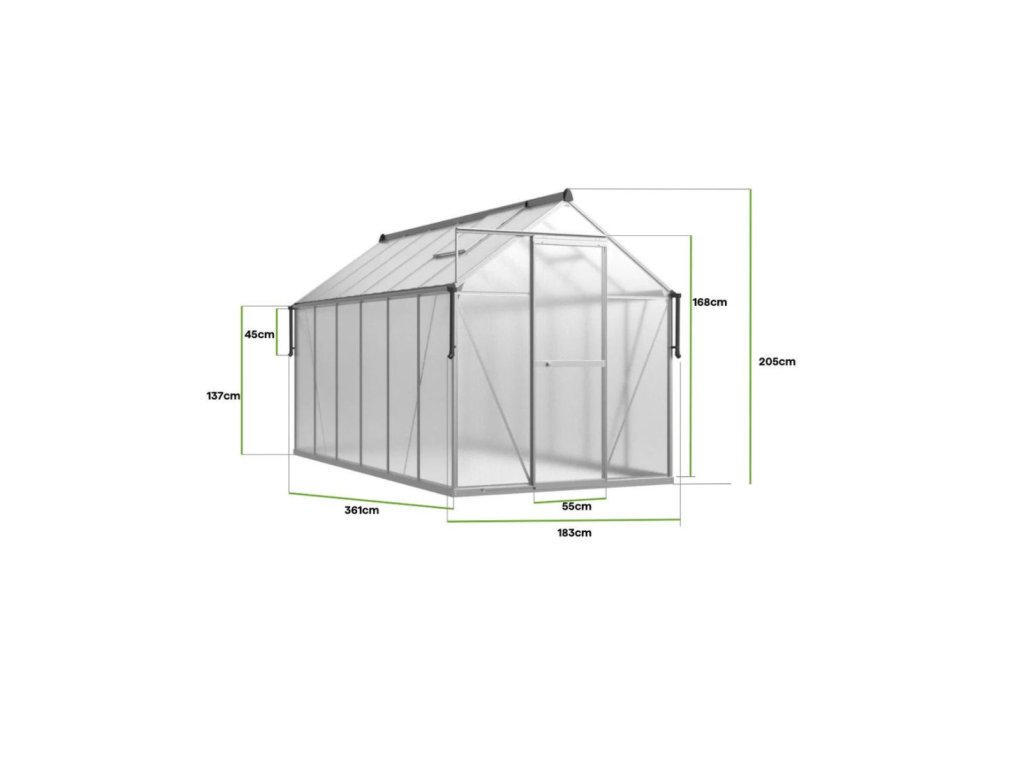 Skleník „Slide-In” 183 x 361 cm je odolné a estetické řešení pro milovníky zahradničení. Je vyroben z 4mm polycarbonátových panelů s UV ochranou, na hliníkovém rámu a pozinkované ocelové základně, což zajišťuje odolnost a stabilitu na dlouhá léta.