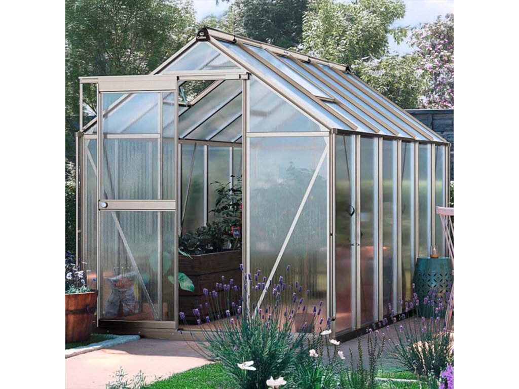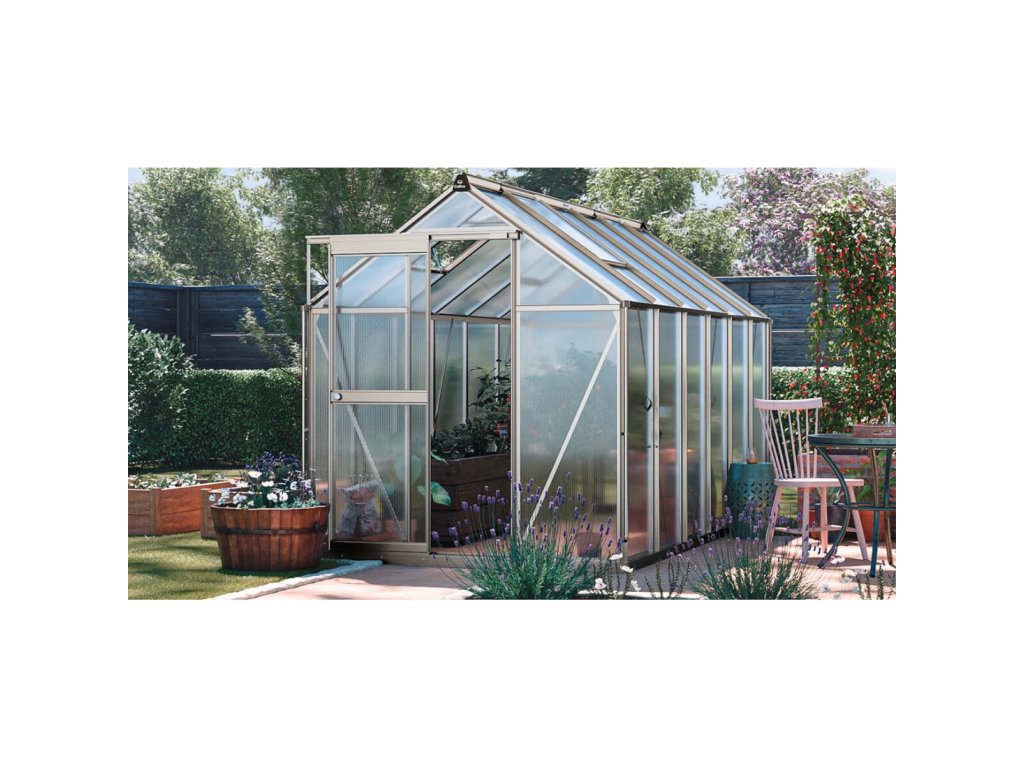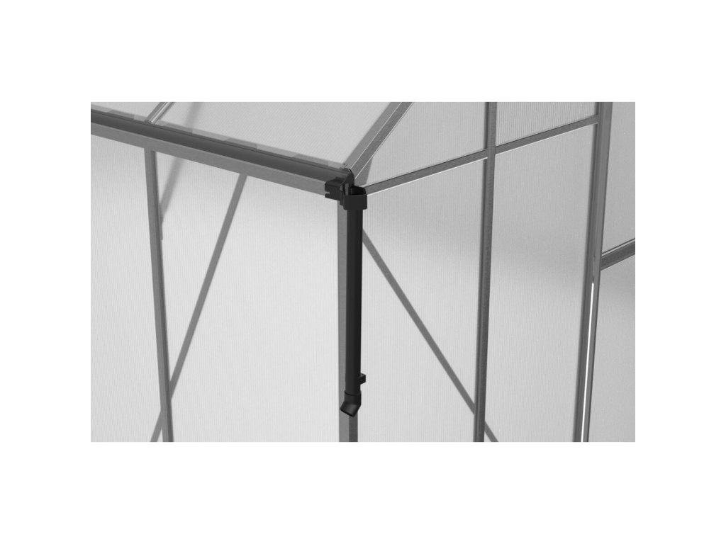 Tato skleník je vybaven 4 mm polycarbonátovými panely obohacenými o speciální ochrannou fólii, která vytváří pevnou tepelnou bariéru a udržuje stabilní mikroklima pro rostliny i v chladných dnech. Dodatečná UV vrstva chrání plodiny před nadměrným slunečním zářením a zajišťuje jim optimální podmínky pro růst.