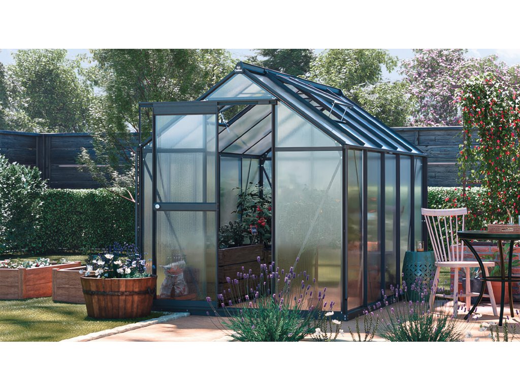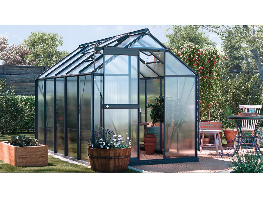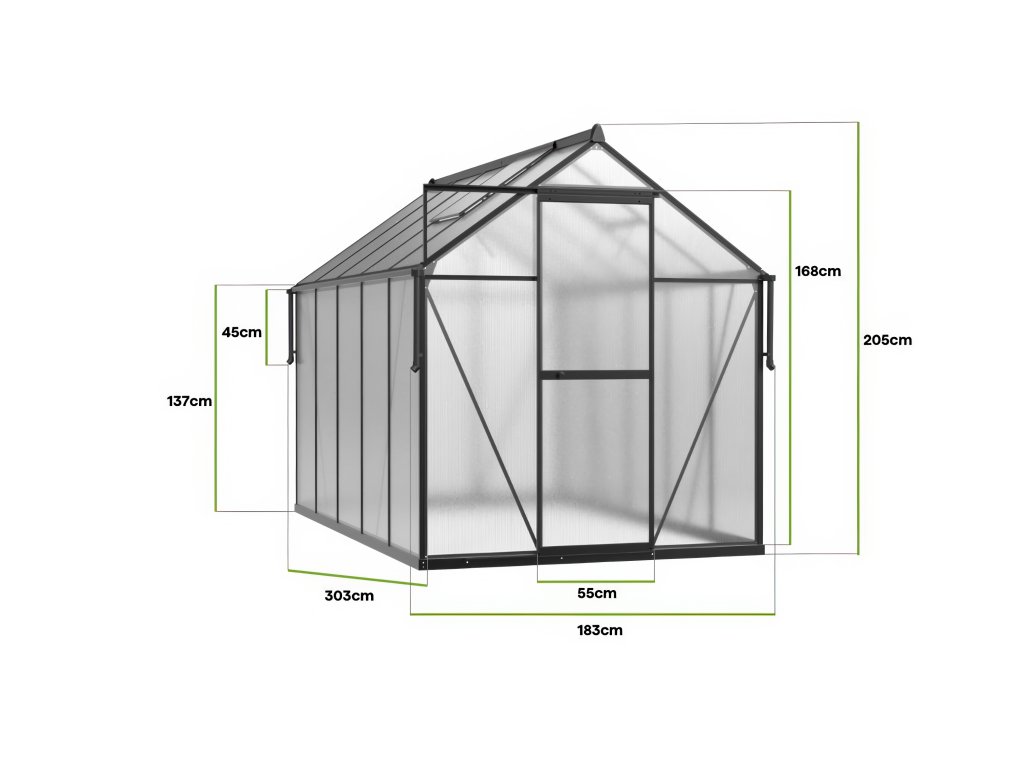 Zahradní skleník z polykarbonátu Slide-In NEW 183x303cm Black od značky Cultivo s vyztuženou konstrukcí je ideální volbou pro ty, kteří chtějí ve své zahradě vytvořit profesionální podmínky pro pěstování rostlin. Vyznačuje se moderním designem a černým provedením, které mu dodává jedinečný charakter. Díky délce 303 cm nabízí hodně prostoru pro vaše rostliny a umožňuje pohodlné pěstování zeleniny, květin i bylinek. Odolné polycarbonátové panely o tloušťce 4 mm s UV ochranou účinně rozptylují sluneční světlo, poskytují rostlinám ideální podmínky pro růst a zároveň je chrání před škodlivým zářením. Robustá hliníková konstrukce a pozinkovaná ocelová základna zaručují odolnost a odolnost vůči proměnlivým povětrnostním podmínkám. Inovativní montážní systém Slide-In usnadňuje sestavení skleníku, zvyšuje stabilitu celé konstrukce a eliminuje nutnost použití spon. Díky dvěma ventilačním oknům a posuvným dveřím skleník nabízí optimální cirkulaci vzduchu a snadný přístup dovnitř. Jeho promyšlený design umožňuje efektivní využití prostoru a díky své estetice je nejen funkčním, ale i dekorativním prvkem zahrady.