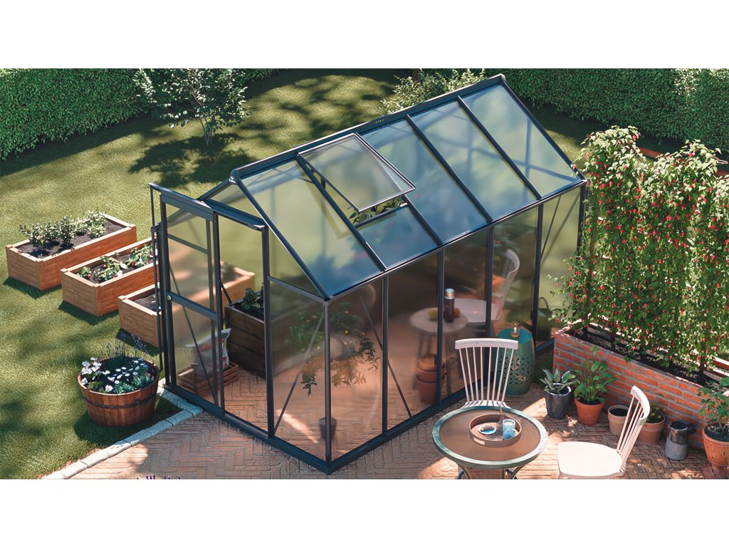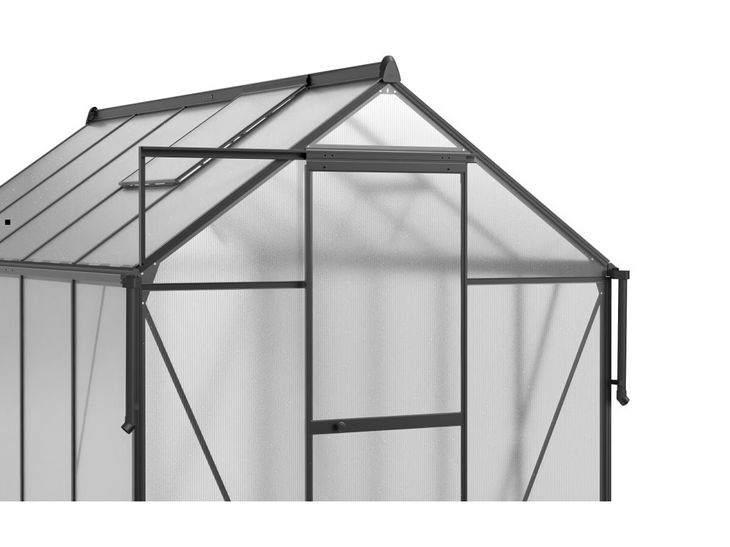 Skleník „Slide-In” 183 x 303 cm je odolné a estetické řešení pro milovníky zahradničení. Je vyroben z 4mm polycarbonátových panelů s UV ochranou, na hliníkovém rámu a pozinkované ocelové základně, což zajišťuje odolnost a stabilitu na dlouhá léta. V modelu 2026 jsme zavedli řadu vylepšení, díky nimž je naše skleník ještě pevnější. Jedná se mimo jiné o hlouběji profilované kolejnice, do kterých se zasouvají panely (stabilnější ukotvení a větší odolnost proti větru), zvýšená hustota polykarbonátu, zesílený prah dveří a silnější příčné diagonální tyče. Díky montážnímu systému „Slide-In“, posuvným dveřím a 2 ventilačním oknům je naše skleník snadno montovatelný, funkční a poskytuje optimální podmínky pro pěstování.