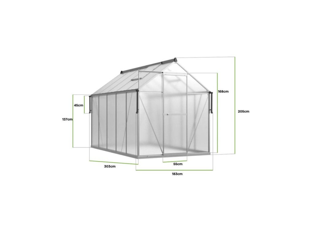 Skleník „Slide-In” 183 x 303 cm je odolné a estetické řešení pro milovníky zahradničení. Je vyroben z 4mm polycarbonátových panelů s UV ochranou, na hliníkovém rámu a pozinkované ocelové základně, což zajišťuje odolnost a stabilitu na dlouhá léta. V modelu 2026 jsme zavedli řadu vylepšení, díky nimž je naše skleník ještě pevnější. Jedná se mimo jiné o hlouběji profilované kolejnice, do kterých se zasouvají panely (stabilnější ukotvení a větší odolnost proti větru), zvýšená hustota polykarbonátu, zesílený prah dveří a silnější příčné diagonální tyče. Díky montážnímu systému „Slide-In“, posuvným dveřím a 2 ventilačním oknům je naše skleník snadno montovatelný, funkční a poskytuje optimální podmínky pro pěstování.